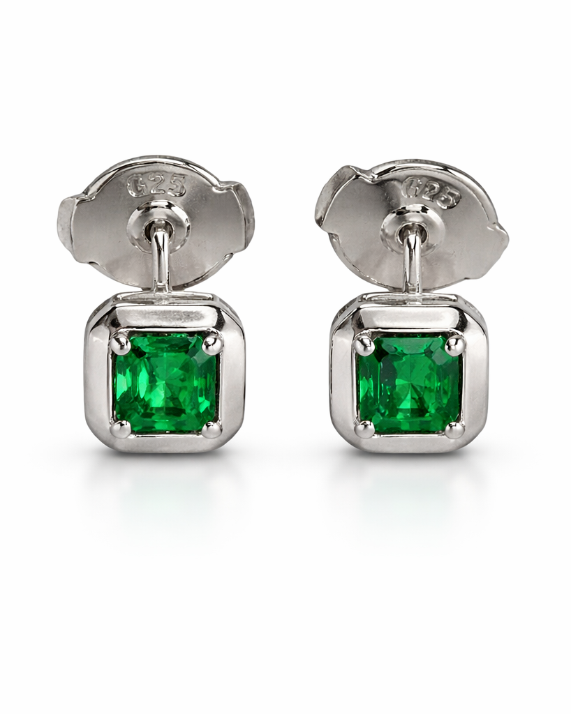 Subtle and refined: square-cut Colombian emeralds , set in a sleek 18k white gold bezel . Elegant, timeless earrings designed for everyday wear or special occasions.