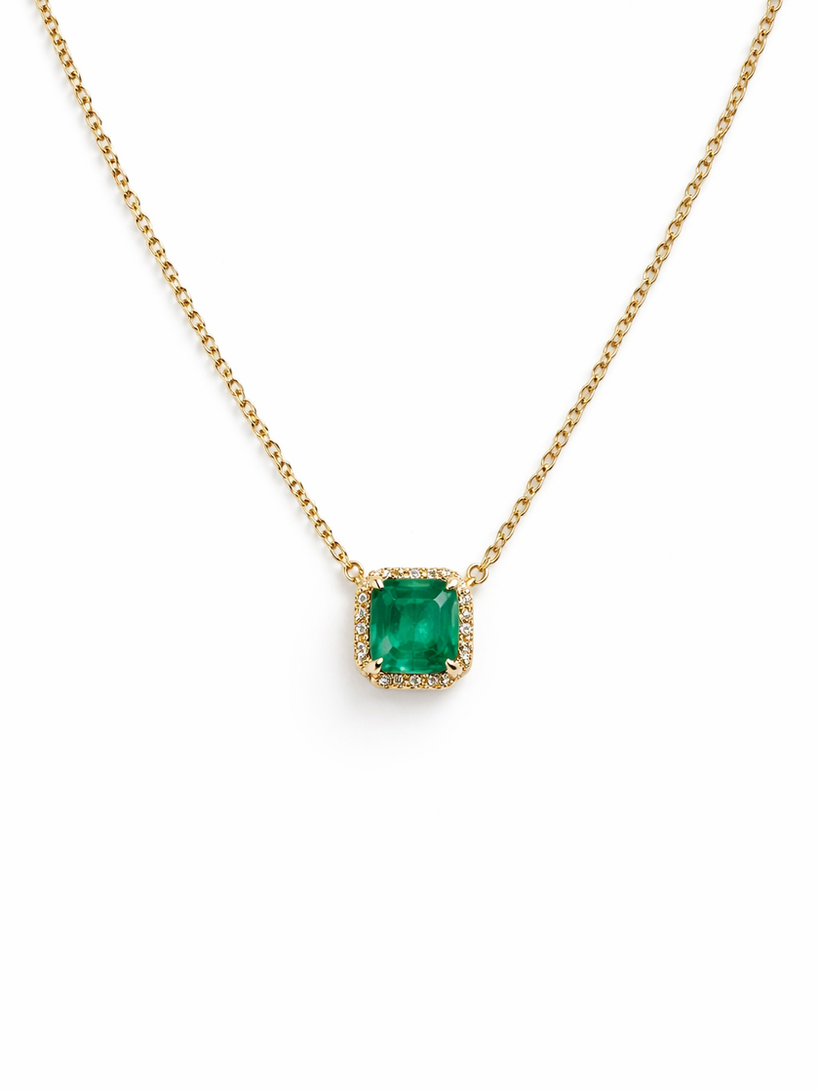 18K yellow gold chain featuring a natural emerald pendant, enhanced with a refined diamond halo that adds brilliance and elegance. A timeless piece designed to balance everyday luxury and sophistication, perfect for both daily wear and special occasions.