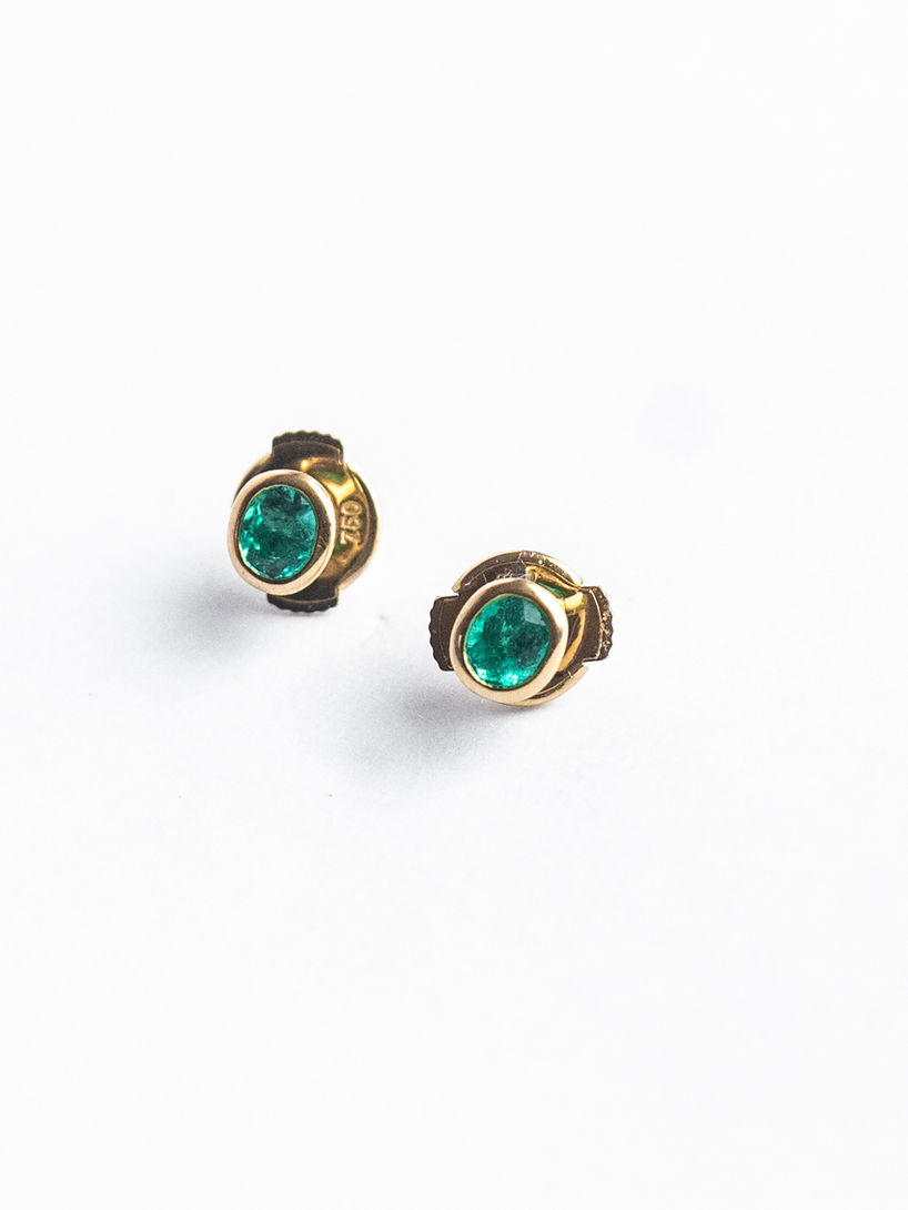 Topos redondos en oro 18K con montura en bisel, realzados con esmeraldas colombianas de intenso verde natural. Un diseño atemporal que resalta la pureza de la gema y la elegancia del oro, ideal para llevar todos los días con distinción.